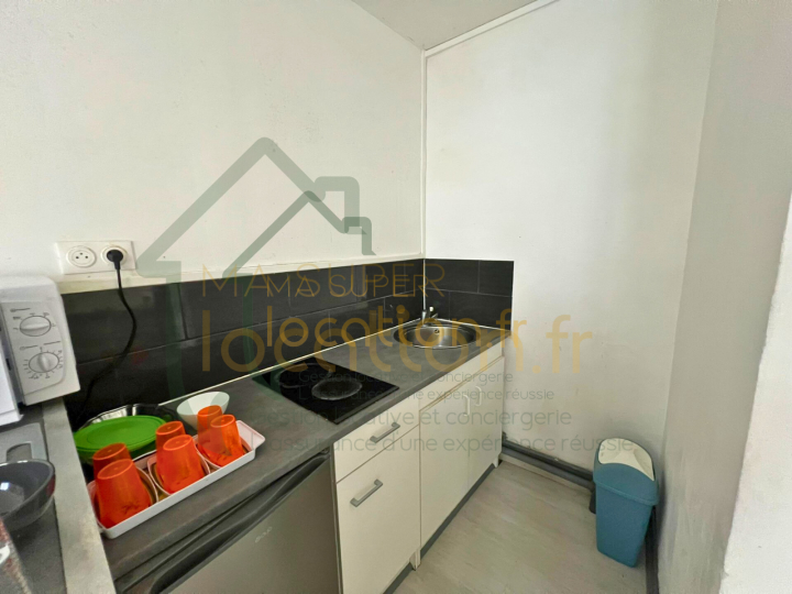 En plein coeur du centre ville, on vous propose un bel appartement situé au rez-de-chaussée comprenant : Un studio avec une cuisine équipée donnant sur la pièce de vie d’environ 16m2 et une salle d’eau avec wc.