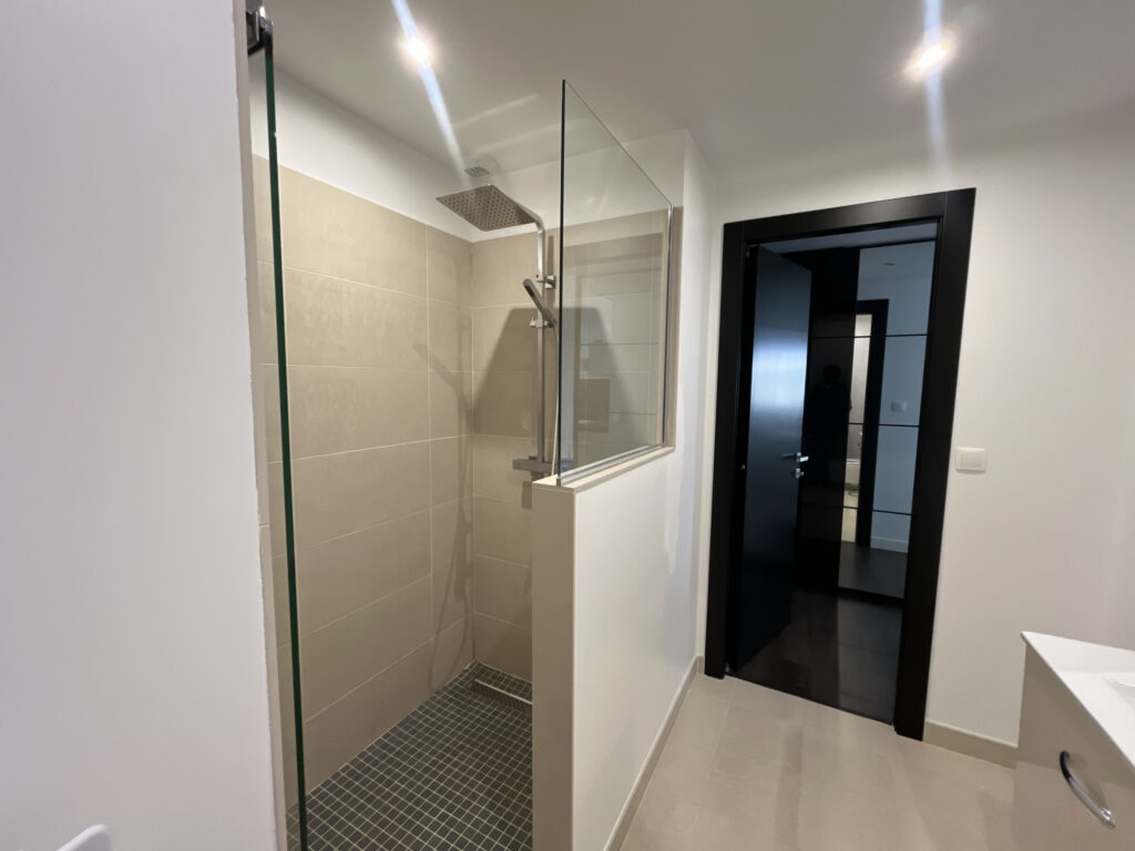– salle de bain avec meuble vasque, armoire miroir, douche italienne, WC avec douchette bidet,