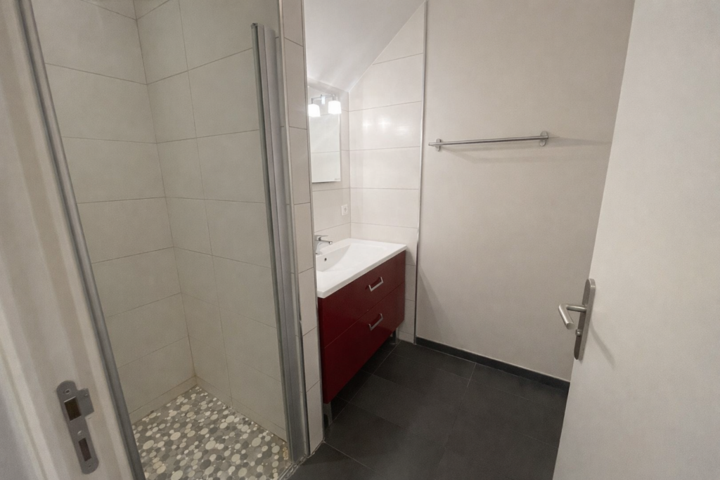 Deux chambres, buanderie, deux salle d’eau dont un avec WC indépendant et un beau séjour-cuisine à l’étage. Disponible de suite.