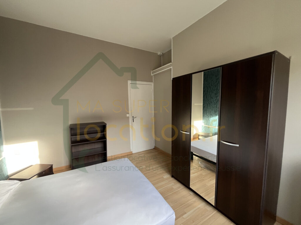 Une chambre avec volets roulants électrique. Salle d’eau avec douche, WC et machine à laver.