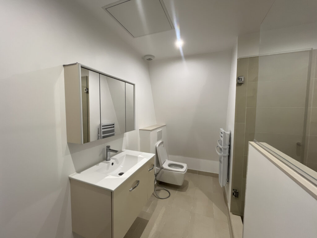 – salle de bain avec meuble vasque, armoire miroir, douche italienne, WC avec douchette bidet,