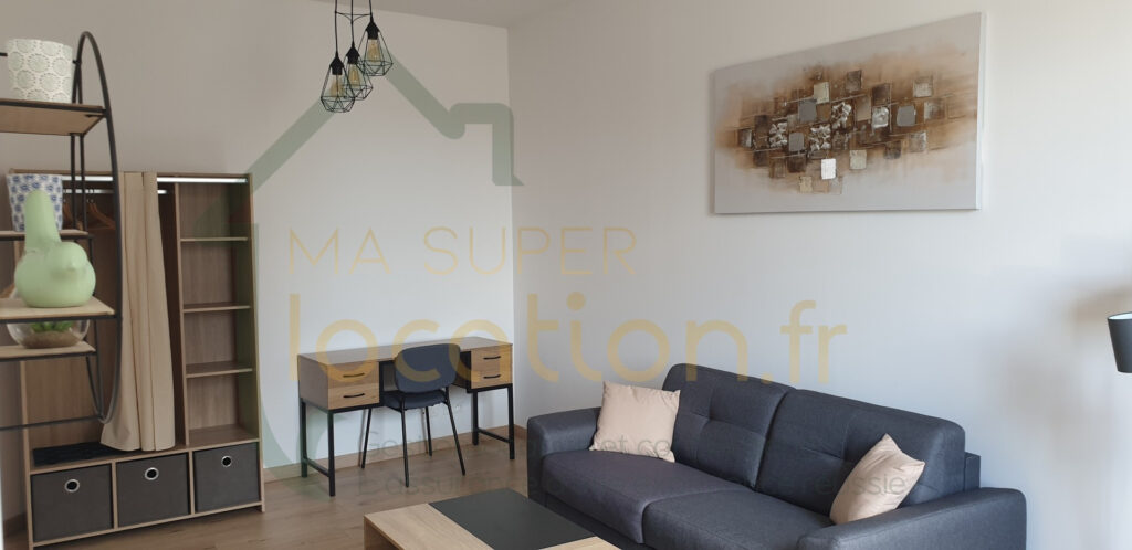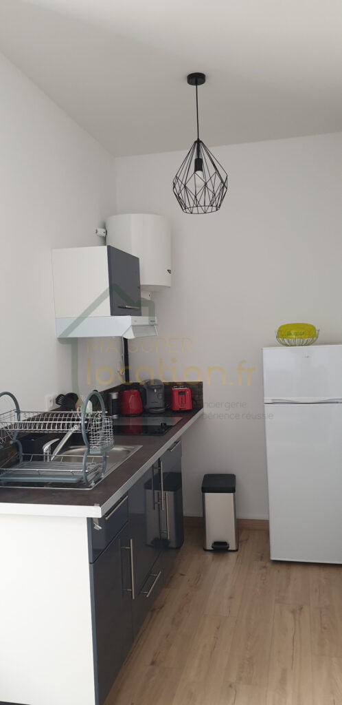 GRAND STUDIO, entièrement meublé et équipé à neuf, entrée sur une pièce de vie très lumineuse avec parquet, cuisine équipée (avec plaques et frigo et micro ondes), salle d’eau avec wc