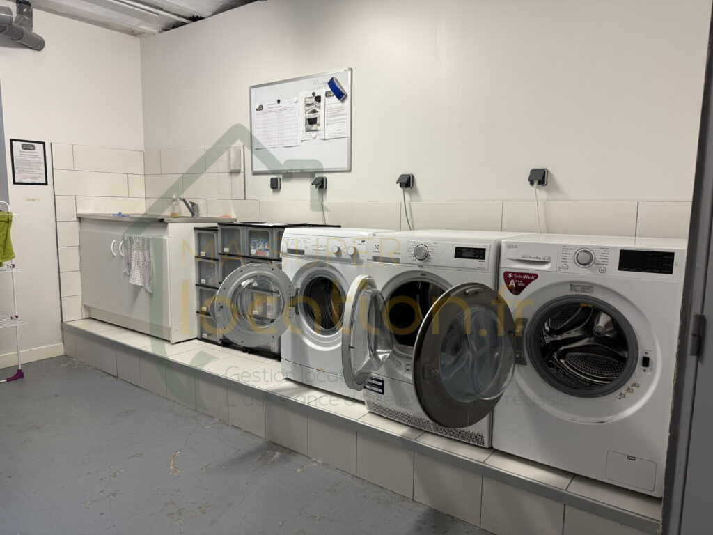 – laverie avec machines à laver, sèche linge, matériel de repassage,